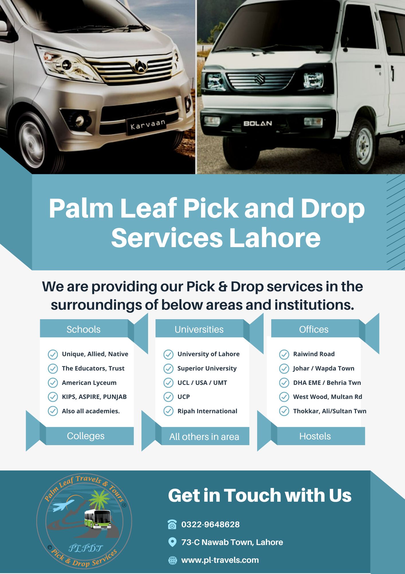 We also have pick and drop services for the students of the University of Lahore (UOL), University of Central Punjab (UCP), University of South Asia (USA), University College Lahore (UCL), Superior University, Qarshi University, Leads University, Ripah International university, University of Management Sciences and Technology (UMT) and all other universities in the area.